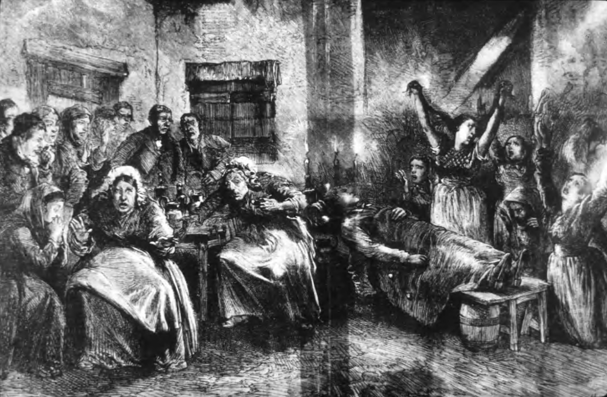 Mr Boucicault, who has a genius for exaggeration of national customs, has depicted, with all the heightened effects of his wonderful stage skill, the grotesque admixture of howling sorrow and tributary “potheen” with which the lower class of Irish contrive to associate mourning with the wantonness of a debauch. In such a play as The Shaughraun, the features of a wake are presented only on their ludicrous side, and in smiling at the farcical outbreaks of crooning stage-hags, paid a shilling a night to howl a dirge in the dismallest of minor keys, we are apt to ignore, if not altogether to forget, the moral and sanitary evils which troop, spectre-like, at the heels of this wretched custom.