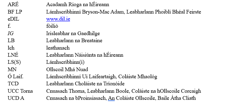 Dillon, M., Mooney, C. agus de Brún, P. (1969) Catalogue of Irish Manuscripts in the Franciscan Library, Killiney. Dublin: Dublin Institute for Advanced Studies.